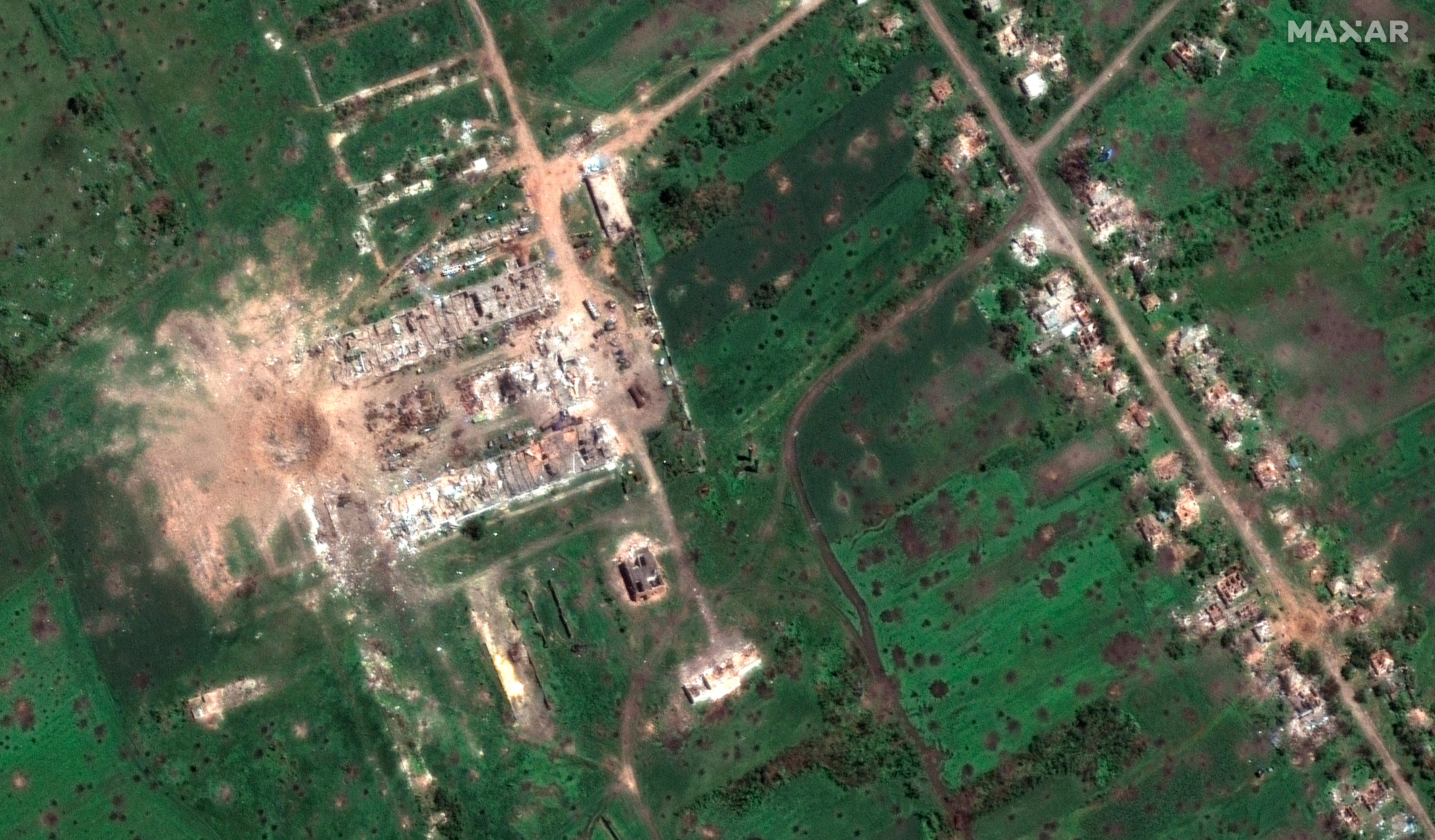 In this satellite image, a 40-meter crater can be seen next to destroyed buildings in Dovhenke, Ukraine, northwest of Slovyansk.